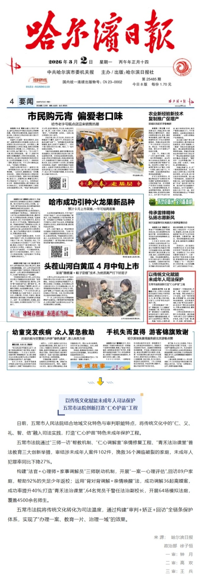 《哈尔滨日报》报道 以传统文化赋能未成年人司法保护五常市法院创新打造“仁心护苗”工程